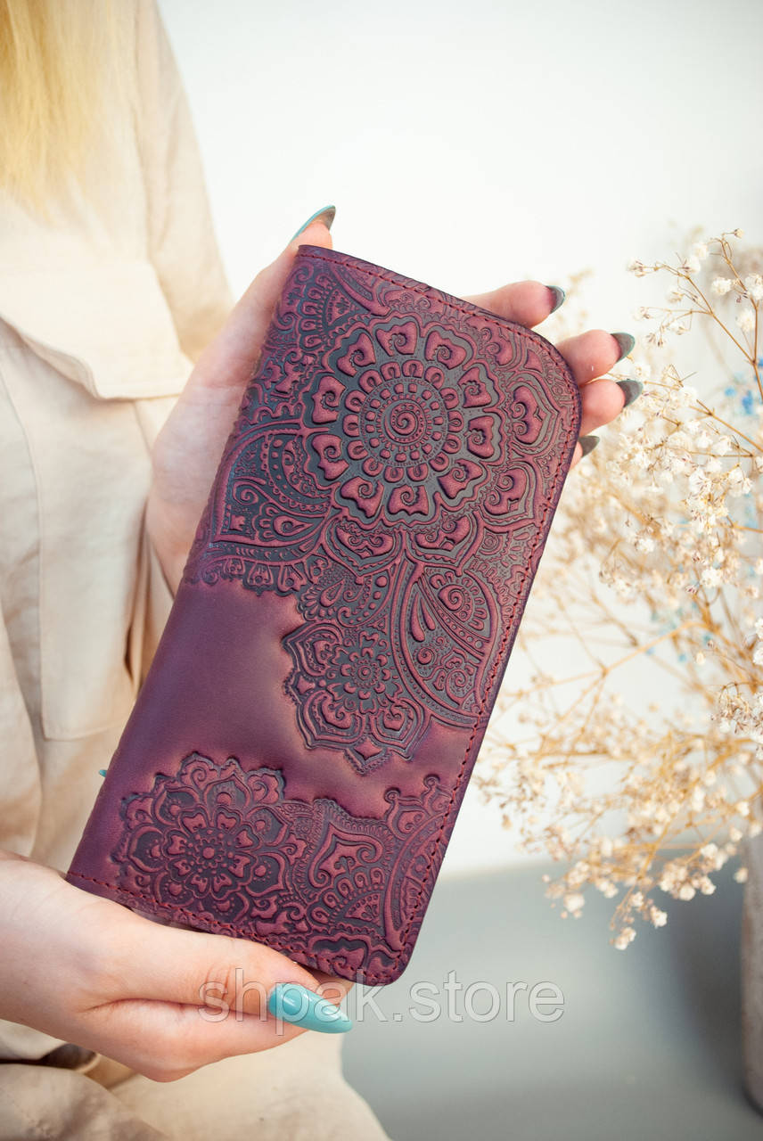 Довгий шкіряний гаманець 🇺🇦 з авторським тисненням Квітучий Сад